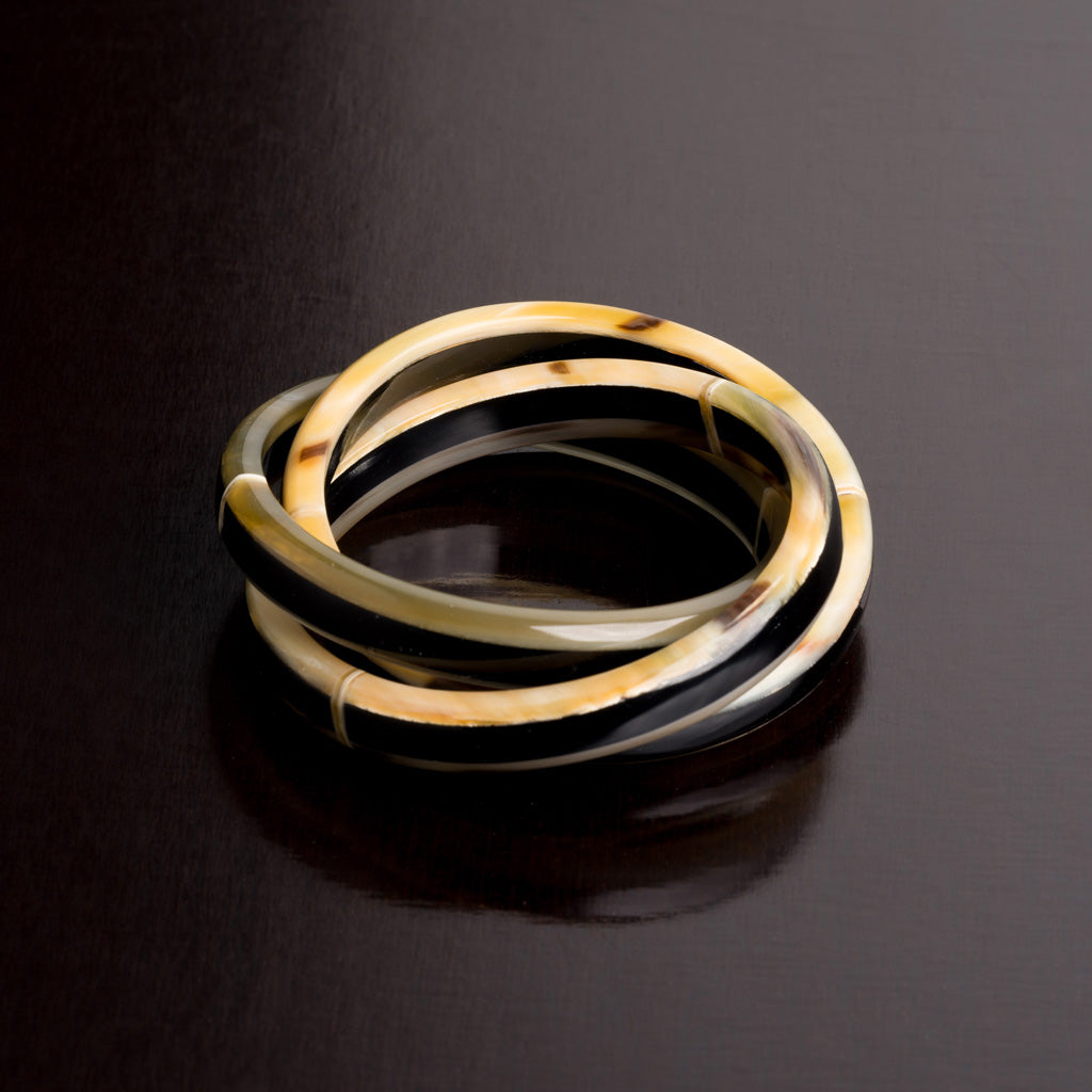 Für Stillsegler „Armreifen Horn verschlungen“ wird mit spezieller Technik natürliches Horn kreisförmig zusammengefügt (Hornnaht). Dies erlaubt, dass verschiedenfarbige Hornelemente ineinandergreifend in traditionell sorgfältiger Handarbeit zu originellen, hochwertigen Schmuckstücken geformt werden können.