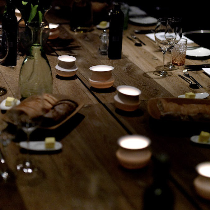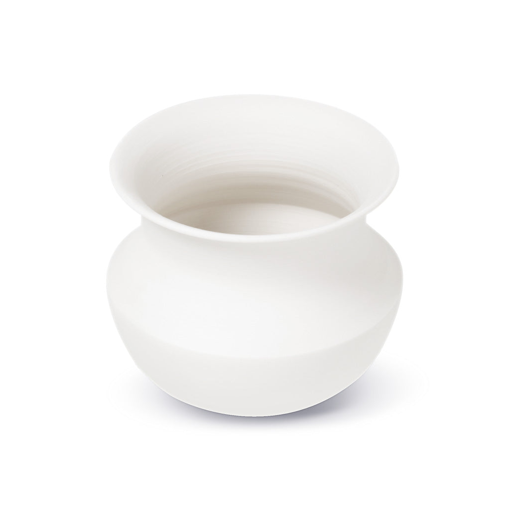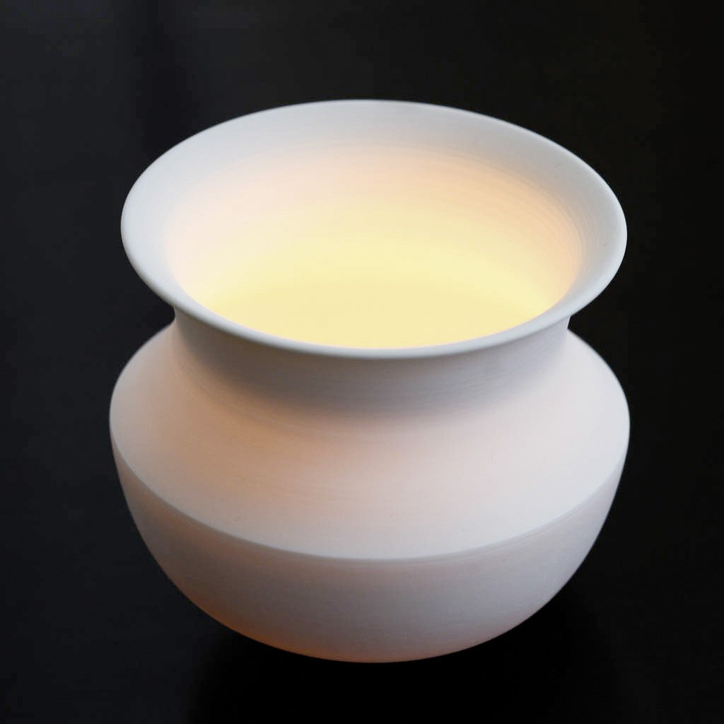 Das Porzellangefäß wird in einer kleinen Werkstatt in Italien handgedreht. Seine dünne Wandstärke lässt das Licht durchscheinen und erzeugt damit eine sehr individuelle Lichtstimmung.