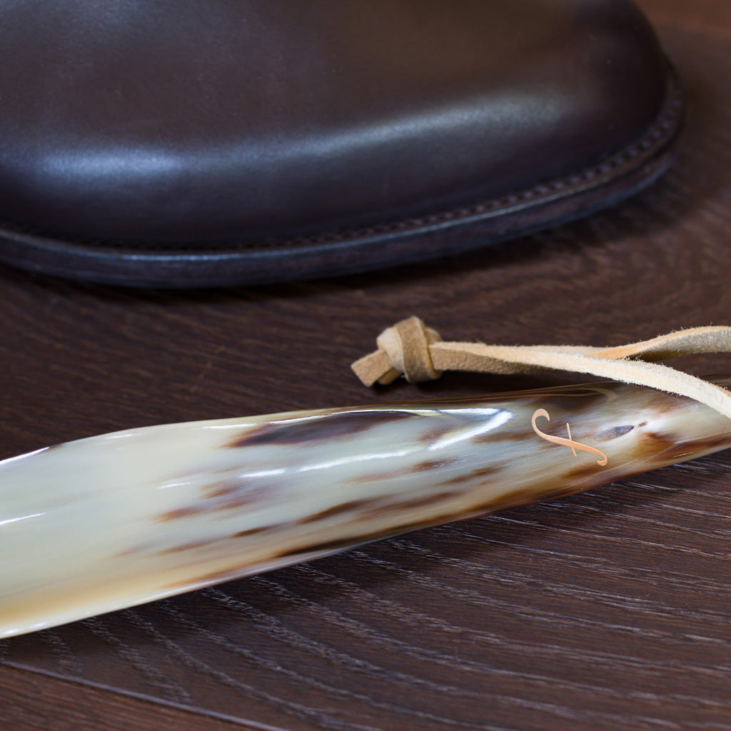 Praktischer Schuhlöffel von höchster Qualität, aus blondem Büffelhorn mit Lederschlaufe.