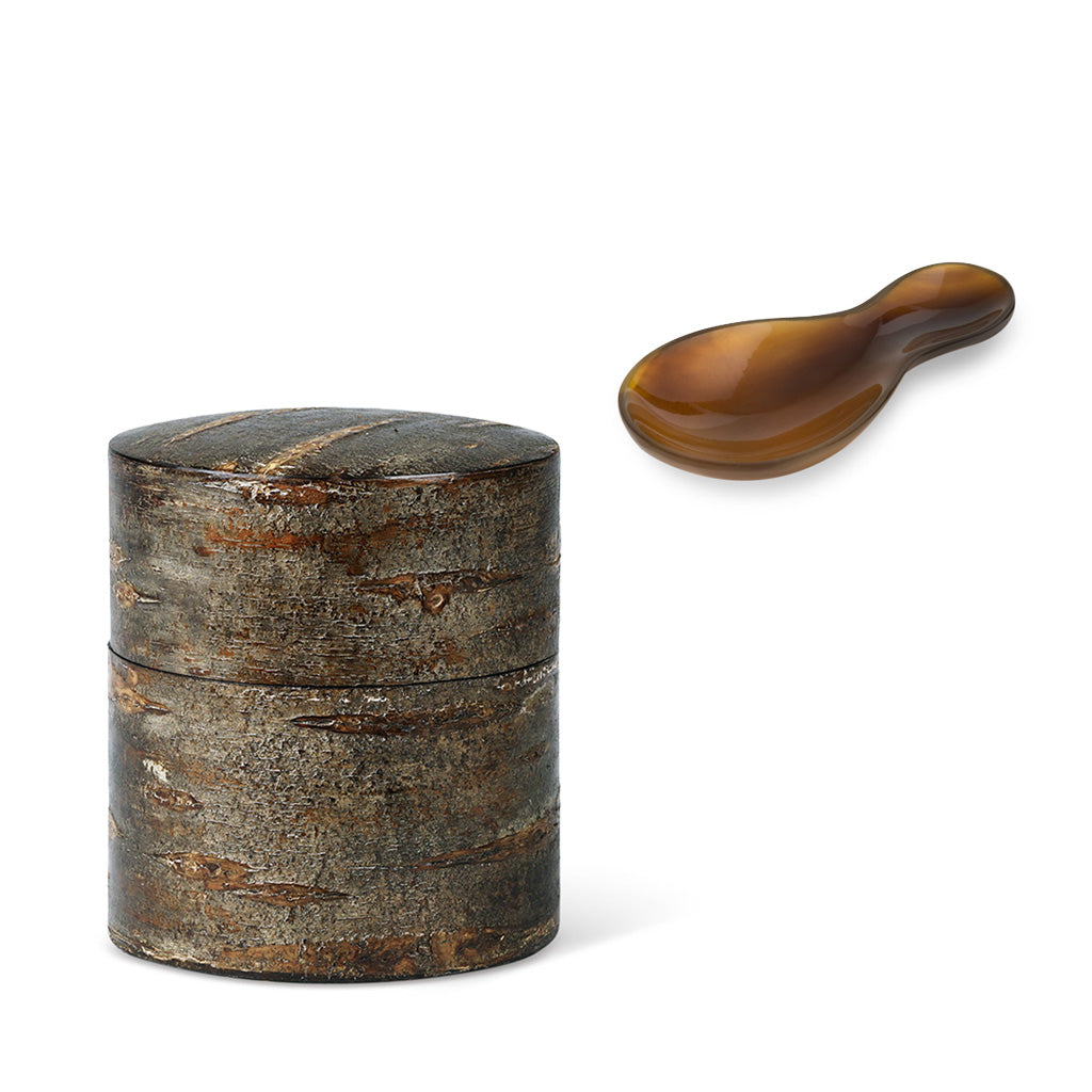 Runde Holzdose mit 100% Kirschbaumrinde, zur artgerechten Aufbewahrung und praktischen Portionierung von losem Tee.