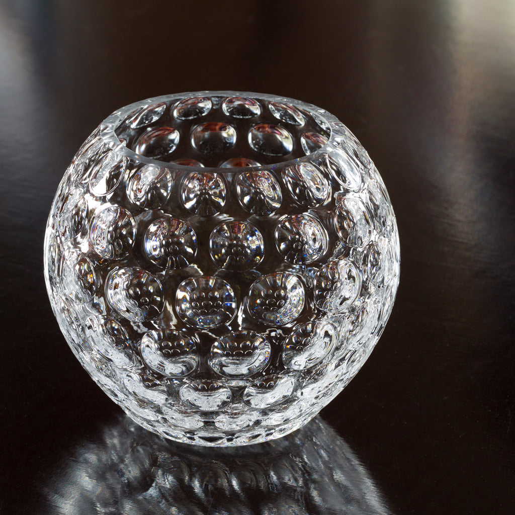 Hochwertige Vase aus dickwandigem Klarglas mit farbigem Unterfang, aus traditionsreicher Glasbläserei in Böhmen in alter Römertechnik am Ofen mundgeblasen. Zusatzfunktion: Verschiedene Varianten zaubern mit ornamentalem Kreisdekor als Windlicht märchenhafte Reflexionen in nächtliche Stimmung.